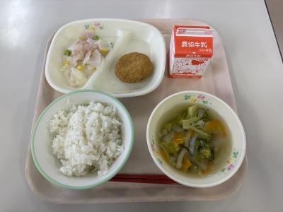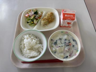 今日の給食は、鶏肉の香草パン粉焼きでした。