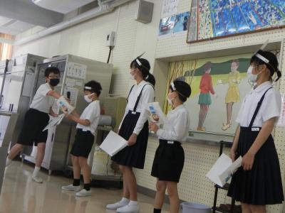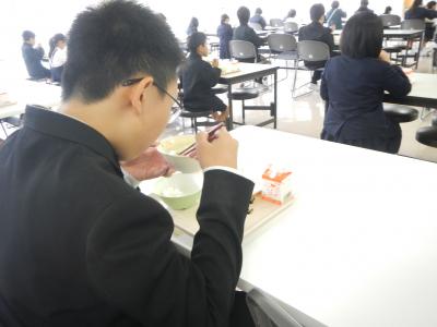 給食委員会が、いただきますの挨拶の際に、コッペパンにコロッケやソテーを挟んでもよいこと、のどにつまらないように、口につめこみすぎないことを話しました。