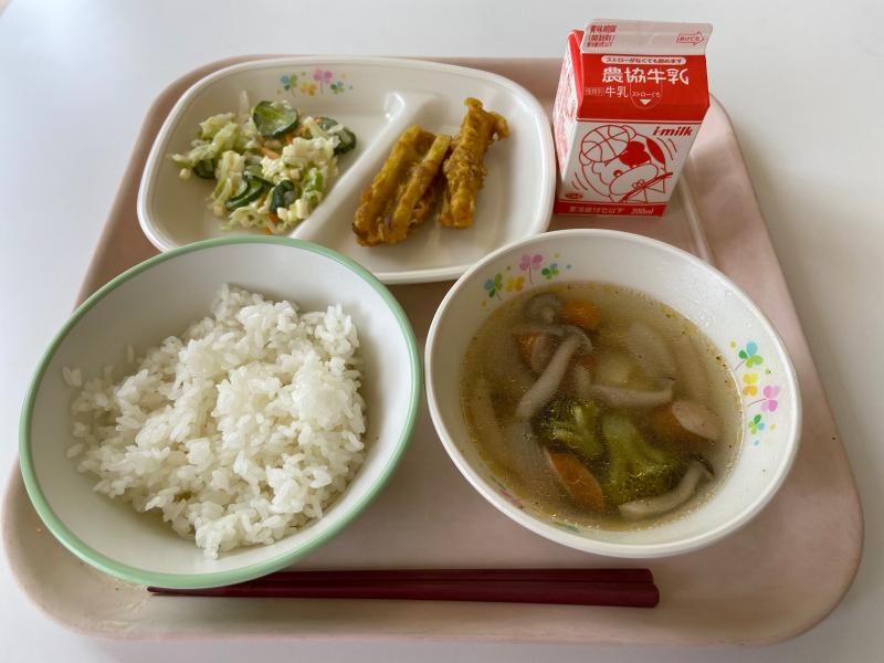 本日の給食献立は、「コッペパン、牛乳、焼きそば、カラフル野菜のコンソメスープ」でした。