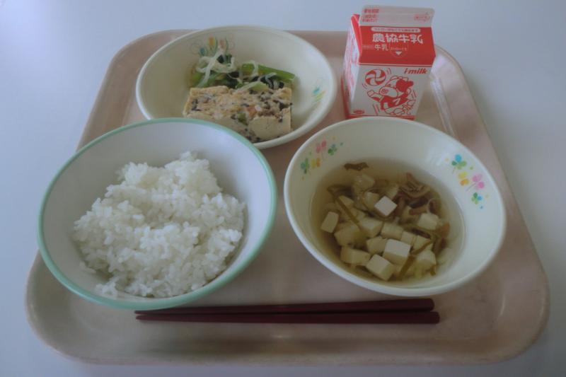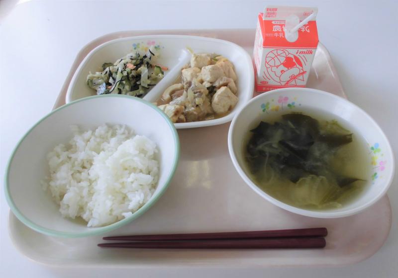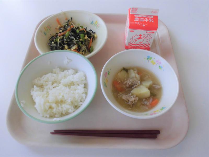 子どもたちが大好きな肉じゃがと、ご飯と一緒に食べるとおいしい「かみかみ和え」で、今日もほぼ時間通りに給食を食べ終えていました。
