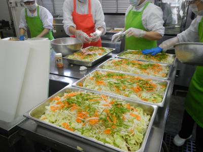 ハンバーグは給食会から取り寄せ、ソースなどは手作りしました。