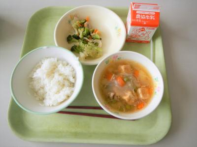 気温が上がってきて、汗もよくかいてしまう季節になってきましたので、塩分も水分もとれ、野菜のたっぷりとれる汁ものを献立に入れました。