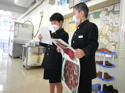 ビーツを知らない子も多いため、写真を見せて、給食委員会に紹介してもらいました。