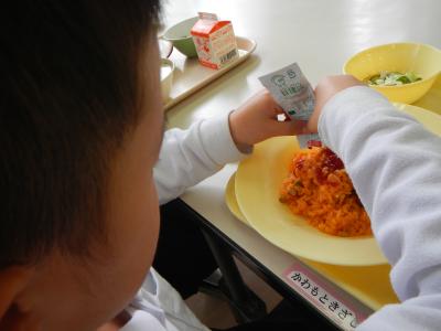 たまねぎソースは手作りで、このソースのときは子どもたちが食べ終わるのが早いので、とてもうれしいです。