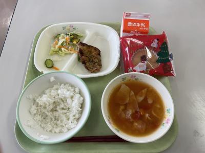 ハニーマスタードチキン、コールスローサラダ、ミネストローネとクリスマスらしいきれいな色合いの給食でした。