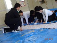 講師は、真脇さん、吉田さんのお二人です。今回は、地域の皆さんから写真を募り、大きなモザイクアートを製作する活動です。一枚ずつ写真を貼って一つの作品に仕上げるものです。二人一組になって写真を布に貼りました。写真を一枚ずつ見ながら、あ見附島や、あ飯田の祭りや、と声を上げる子ども達でした。そして最後には大きな能登半島と文字が浮かび上がりました。みんなが参加して、最後の仕上げを行わせてもらいました。