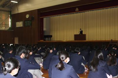 始業式:校長先生から今年の始業式は昨年度の終業式の振り返りから始まり、春休みの過ごし方と今年1年の目標について訓話がありました。