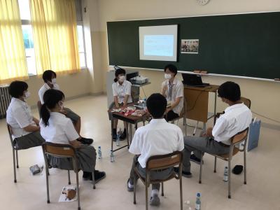 一般社団法人サポートスズさんのはからいのもと、総勢15名の珠洲在住のU・Iターン者にご来校いただき、小グループに分割したうえで、生徒は、大学での学びのこと、大学生活のこと、いま珠洲に暮らしながら考えていることなどについてお話を聴きました。
