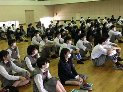 今年の夏休みに行われたアステナホールディングスインターンシップに参加した5グループ13名の生徒に対して、岩城社長様から直接に1グループ10万円の奨学金目録が授与されました。卒業時に進学等の費用として役立てるために贈られることを約束するものです。生徒を代表して、3年B組の浦純華さんが貴重な経験を与えてくださったことに対して謝辞を述べました。