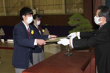 担任の先生からの呼名に、マスク越しからでも聞こえる力強い声で応えてくれました。式では卒業証書以外に各種表彰も行われ、各クラスの代表者や表彰者が賞状を受け取りました。