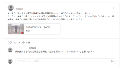 休業期間中、生徒自身が自分の課題と向き合い、何をすべきか自分で考え、自主練習を行いました。また、その様子を(トレーニングに限らず!)自身で撮影し、チームメイトに紹介しました!みんなでシェアすることで「アドバイス」を送ったり、自宅でのトレーニングの参考にして、自主練習の「質」をより良いものにしていきました。生徒の中には、「家族のご飯をつくる」をテーマに料理のレシピを紹介しているユニークなものもありました。