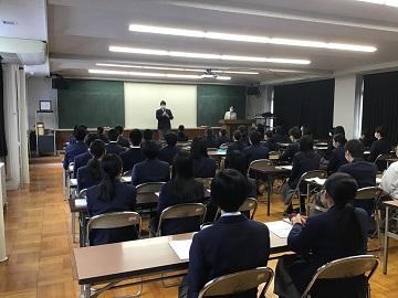 始めに、教頭先生から「今年は困難と試練の一年と言えるかもしれないが、その中で困難と試練を乗り越える力を身につけてきた。今後の良い一歩となるように頑張ってきてほしい」と激励の言葉がありました。その後、共通テストや感染症対策についての説明がなされ、各担任から一言ずつ生徒に対して「何が起こっても大丈夫」「後ろでも下でも遠くでもなく、前をしっかり見よう」「すべてが今後の糧となる」といった応援の言葉が送られました。