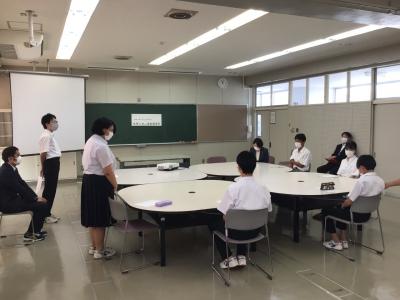 7月26日(月)に、緑丘中学校3年生・宝立小中学校9年生を対象に、各中学・小中学校を卒業した本校生徒が講師を務める進路講演会が開かれました。どちらの学校も、生徒間の対話を重視した形で行われました。