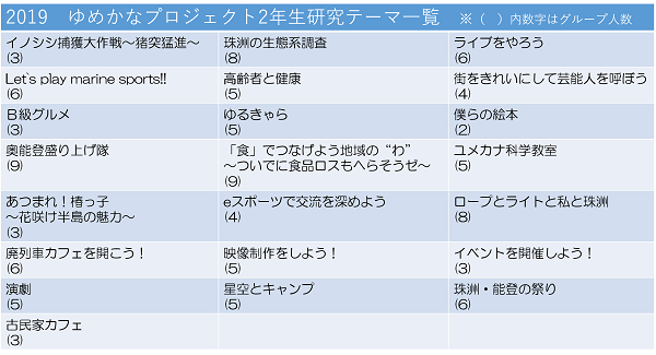 4月12日(金)、第1回目のゆめかなの時間では、初回オリエンテーションとして、1・2年生の学びの大まかな流れについて説明しました。その後、1年生は自分の学びの心とじっくり向き合う時間を過ごし、2年生はグループごとに初顔合わせし、探究活動をスタートさせました(下表は探究テーマの一覧です)。
