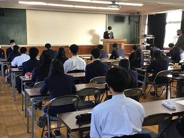 始めに、教頭先生から「今年は困難と試練の一年と言えるかもしれないが、その中で困難と試練を乗り越える力を身につけてきた。今後の良い一歩となるように頑張ってきてほしい」と激励の言葉がありました。その後、共通テストや感染症対策についての説明がなされ、各担任から一言ずつ生徒に対して「何が起こっても大丈夫」「後ろでも下でも遠くでもなく、前をしっかり見よう」「すべてが今後の糧となる」といった応援の言葉が送られました。