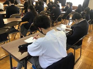 3年生と語る会は、進路が決定した3年生が進路が決定するまでの経緯や自身の経験から2年生にアドバイスをする会です。例年なら名前の通り3年生と2年生とが語らう形で行われていますが、今年度は3年生がスピーチをして2年生がメモを取るという形式で行いました。