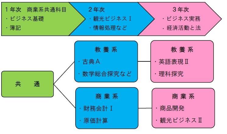 普通科・ビジネスコースでは、1年次にビジネスの基礎を学び、2年次より教養系、商業系に分かれます。商業系では、会計や観光に関する商業科目を学び、地域で活躍する社会人として必要な能力を育成します。また、教養系では、国数英などの普通教科を多く学び、進学のための学力を育成します。これまで総合学科が築いてきた学びを受け継ぎつつ、新たな一歩を踏み出します。
