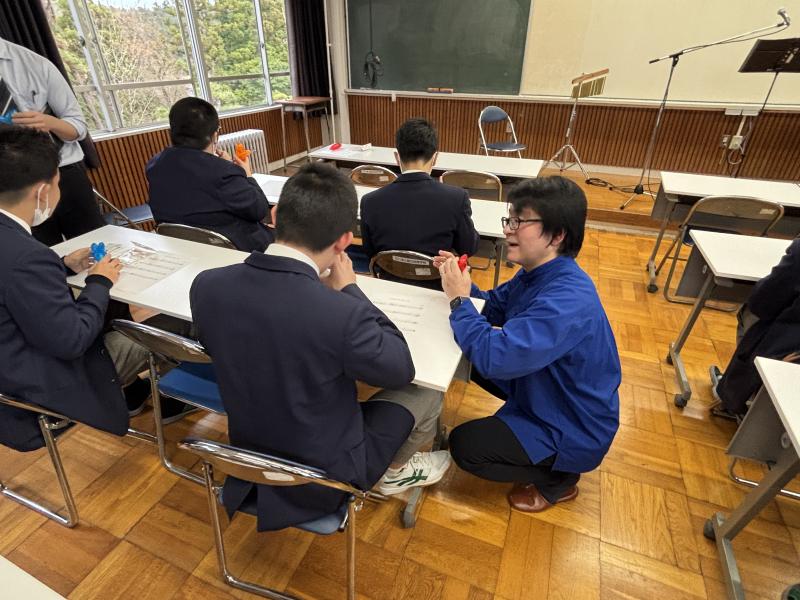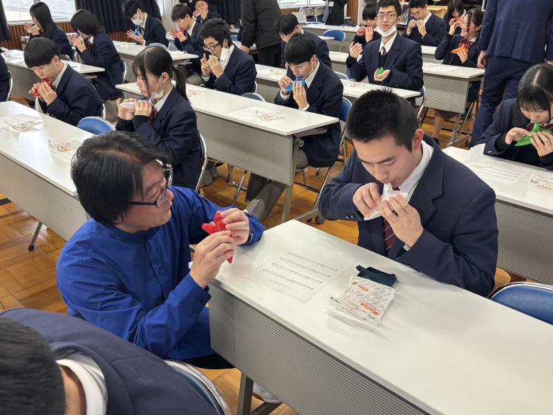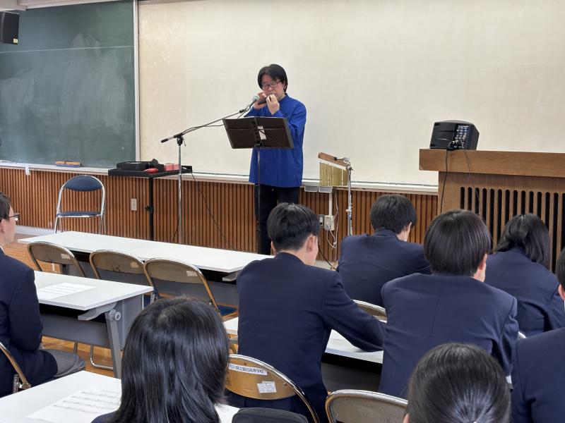 12月16日(火)、「オカリナ体験会」を実施しました。講師として善久さんをお招きし、体験に先立ってオカリナの演奏を披露していただきました。善久さんの奏でるオカリナのやさしく澄んだ音色が教室に広がり、生徒たちは実際の演奏を間近で聞くことで、オカリナの魅力や表現の幅を感じるとることができました。