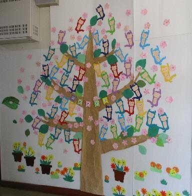 ライブラリー前の,ライブラリー側の壁面には,1年を通して大きな木が掲示されています。3月までは卒業した6年生1人1人が鳥に変身し,まさに飛び立とうとしていました。