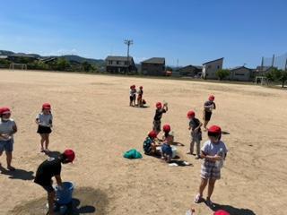 今日は、井上小学校のグラウンドのどんなところに水溜りが出来るかの予想を確かめるために、ビー玉を転がして地面のへこんでいるところを探しました。
