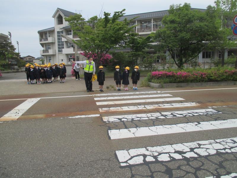 警察の方や町役場の方に来ていただき、歩道の歩き方、横断歩道の渡り方を教えてもらいました。