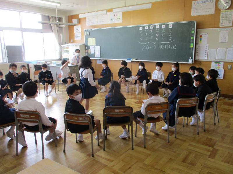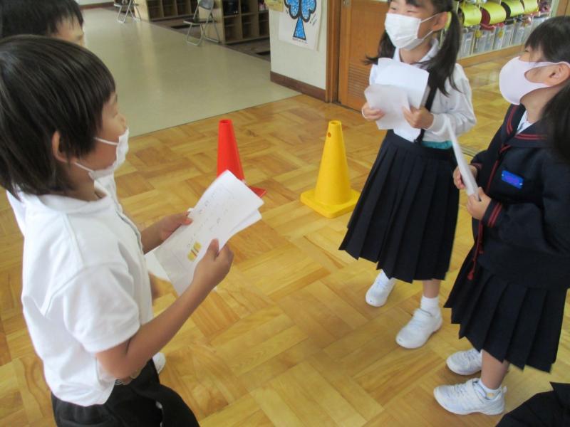 今日、1組はフルーツバスケット、2組は学校探検をしました。