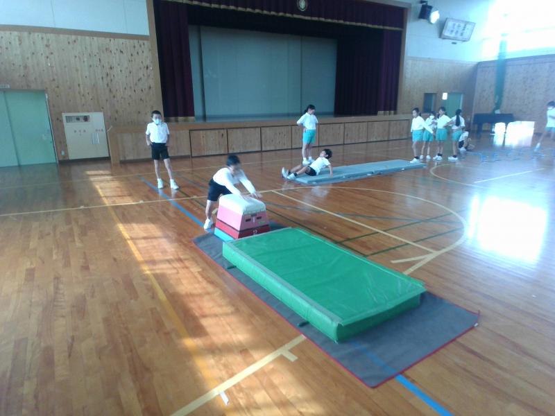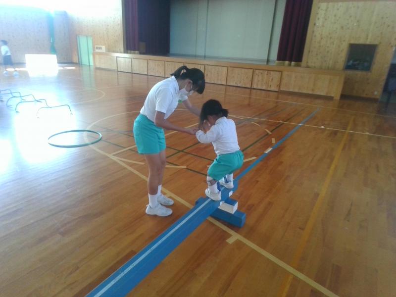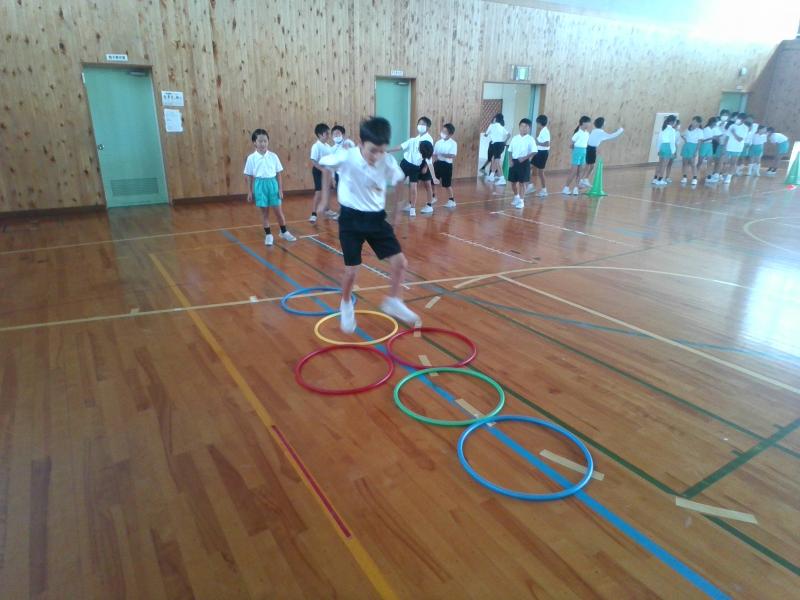平均台、マット、ミニハードル、跳び箱などの障害物を乗り越えていくアスレチックコースを作り、全校児童に遊んでもらうイベントです。