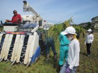 「米作りの先生」小泉孝さんから,稲の刈り方を教わった後,ペアで交替しながら作業しました。
