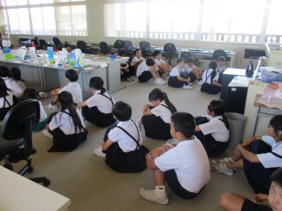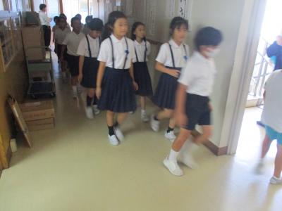 11日(水)に大雨・洪水による避難訓練がありました。放送後、6年生は教室で待機し、1階2階の児童230名ほどが3階のワークスペースや特別教室に避難しました。その後、各教室で振り返りをしました。