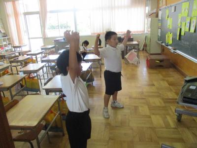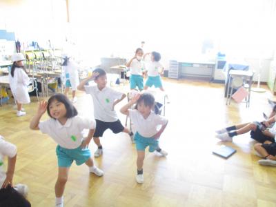 暑い中ですが、各学年で運動会の練習が始まっています。それぞれの種目も決まり、体育館や各教室で掛け声やダンスの音が聞こえてきます。13日(金)の昼休みに1階を通ってみますと、1年生が教室でダンスの練習をしていました。曲は、「ミッション!健・康・第・イチ」です。曲に合わせて身体全体を使って一生懸命におどっています。これからどのように仕上げていくのか楽しみです。