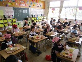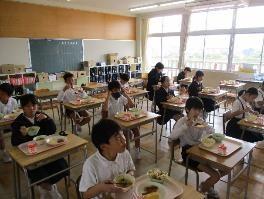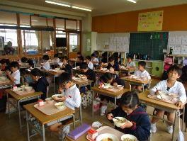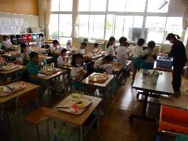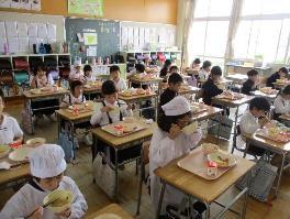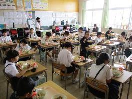 厨房を始め,給食施設や調理の様子等の確認を終え,給食時間になると5年1組の教室に来てくださいました。5年生の,量に差をつけた盛り付けの様子をご覧になった後,学校給食で大事にしていることや気を付けていることを5年生に話してくださいました。そして,少しずつ食べられる食品の種類や量を増やしてもらえると嬉しいとおっしゃいました。その後,5年生と共に昼食を摂り,午後は再び厨房などの確認や校長との懇談を行いました。