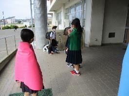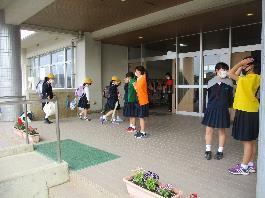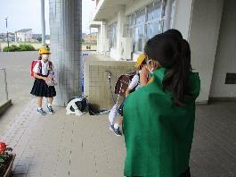 火曜日の「あいさつ戦隊」は,マントだけではなく被り物も着けてパワーアップしていました。「あいさつ戦隊」の仕事は児童玄関での挨拶だけではありません。その後,各教室に行き,「おはようございます」ビームを送っています。以下の写真は水曜日の朝の様子です。