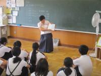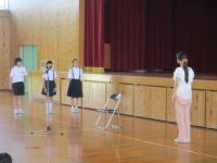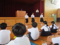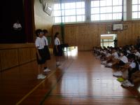 19日(金)4限に体育館で1学期の終業式を行いました。まず、1学期に取り組んだことについて話しました。あいさつや服装を揃えること、返事や話し方聞き方、時間をみて行動等、4月から取り組んだことを振り返りました。そして子どもたちの成長について伝えました。それから夏休みについて、気をつけてほしい事を一つ、がんばってほししことを一つ話しました。まず、気をつけてほしいこととして「自分の命は自分で守ること」を話しました。危ないことは絶対しないことを忘れずに毎日を過ごしてほしいと話しました。がんばってほしいこととして、「自分で決めたことを守ること」を話しました。周りのことをよく考え、きまりを守って行動することを伝えました。最後には、津幡町を代表として国内派遣が決まった4人の紹介をしました。4人は、5年久禮将仁さん、6年今村涼菜さん、冨田蘭さん、谷内七海さんです。写真はその時の様子です。子どもたちにとって、安全で楽しく充実した夏休みになってほしいと願っています。