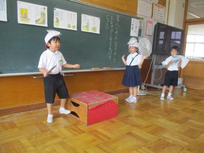 16日(火)5限目の時間に1年1組と数人の先生方が1年2組 「なりきり おむすびころりんげきじょう」に招待されました。1年2組さんがこれまで一生懸命に練習していることは、見たり聞いたりしていましたが、今日はその音読発表会でした。まずは、ナレーターの大きな声と大きなふりつけでおどる子どもたちの姿にとても驚きました。1年生とは思えないくらいに堂々と発表していました。この国語科の学習では、
