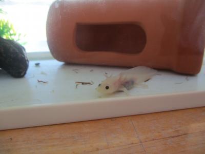 1学期に委員会の児童が企画したアンケートで上位になったウーパールーパーが玄関の生き物コーナーに仲間入りしました。