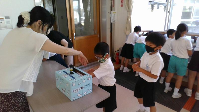 1組は6月27日、2組は30日に保健室の先生の上端先生から正しい手洗いの仕方を教えてもらいました!