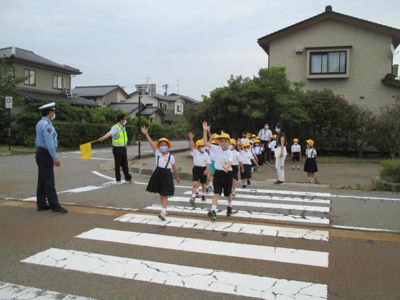 6月8日(水)、警察署と役場の方から、道路の歩き方について教えていただきました。始めに、DVDを見て道路の歩き方を学びました。「歩道を歩く」「白線の内側を歩く」「横断歩道を渡る前は止まる」「右・左・右を確認して手をあげる」などを確認しました。次に、道路へ出て実際に横断歩道を渡ったり歩いたりしました。次々と来る車を見て、いつ渡ろうか慎重にタイミングを見計らっていました。無事に全員渡ることができました。ぜひ、ご家庭でも通学路や家の周りの歩き方を確認していただけたらと思います。