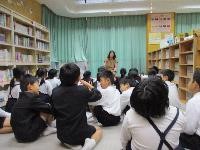今学期1回目の昼のお話会が行われました。4年生以上は音楽室で,英語の絵本を読んでいただきました。ちょっと難しいものは日本語訳の絵本を見せてくださり,どれも楽しかったです。「No,David!」は大変面白く子供たちもよく笑っていました。3年生以下は図書室(ライブラリー)で紙芝居をしていただきました。2匹の犬が言い争いをしていたらサルに美味しいおにぎりを取られてしまうなど,こちらも楽しいお話でした。