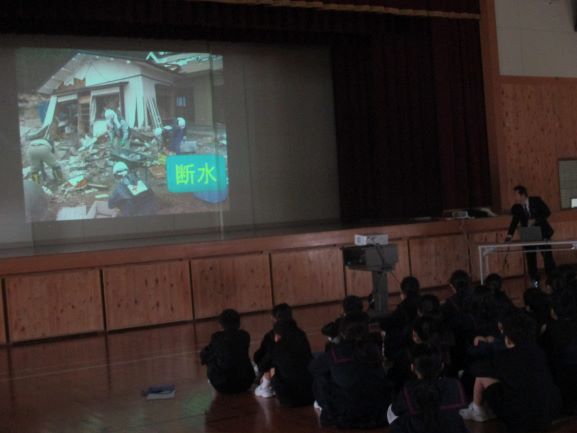 初めに,津幡町社会福祉協議会の北村さんから,災害地の様子や避難所の生活について教えていただきました。トイレの使い方も,動画を用いて分かりやすく解説していただき,子どもたちは真剣に聞いていました。