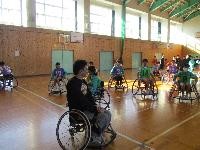 6年生の総合的な学習の時間「未来をデザインする~夢に向かって~」の学習で,車椅子バスケットボールの選手,岩崎大輔さんと半田幸司さんをお迎えしました。生活用の車椅子とバスケットボール用の車椅子の違いを教えていただいた後,早速車椅子をお借りしてバスケットボールを体験しました。シュート練習や鬼ごっこでウォーミングアップをし,チーム対抗のゲームをしました。子供たちは「習うより慣れろ」で,車椅子の操作も上手くなり真剣に試合をしていました。