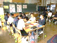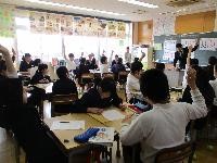 そして,いよいよ数学です。算数で「計算の工夫」として学習している内容と似ていましたが,算数で使わない用語が出てくるなどしました。しかし,扱う数が全てトランプの数であり,どのカードが来るのか分からなかったり,ババ抜きのように相手のカードから選んだりするというゲーム性がありました。「数学」という堅苦しさがなく,子供たちは皆楽しんで計算したりグループで話し合ったりしていました。