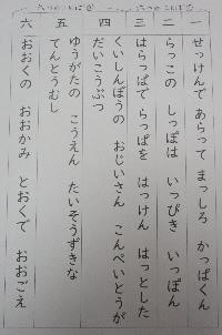 子供たちの「言葉の力」を伸ばすために,先月から暗唱に取り組んできました。今月の初めまで,1~3年生の子供達が言葉を覚え,なかよし班の上級生(4~6年生)に聞いてもらっていました。体育館の渡り廊下には,上級生に聞いてもらって合格した子供たちの名前が貼られています。