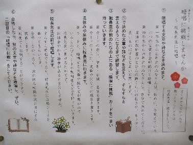 多くの子供たちが暗唱に挑戦し,言葉の力と覚える力を伸ばしてほしいと思います。校長お勧めの詩や言葉を職員室前に置いてあります。