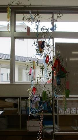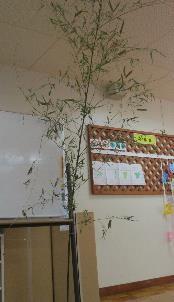 井上公民館館長の南さんからいただいた笹に,1年生が,願い事を書いた短冊と飾りを付けました。笹が賑やかになり,七夕らしくなってきました。時々願い事を読んでいる上級生の姿が見られ,ほほえましいです。