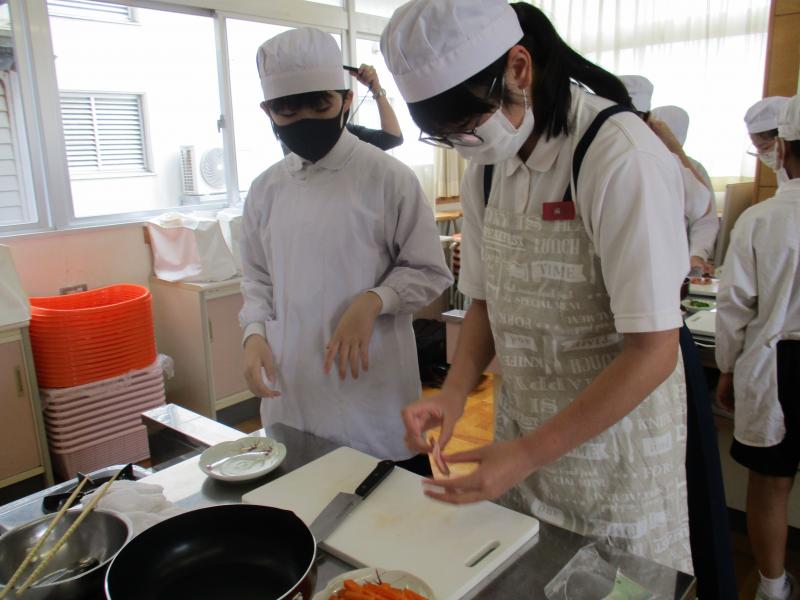 6月7日(火曜日)、6年生が家庭科の授業で調理実習を行いました。調理したのは「野菜炒め」です。