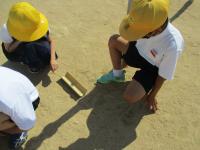 今日は、井上小学校のグラウンドのどんなところに水溜りが出来るかの予想を確かめるために、ビー玉を転がして地面のへこんでいるところを探しました。