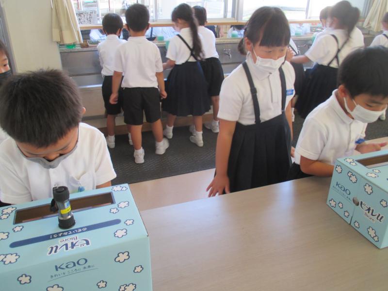 教えてもらった後は、きれいに手洗いできているかどうか実験をしてみました。