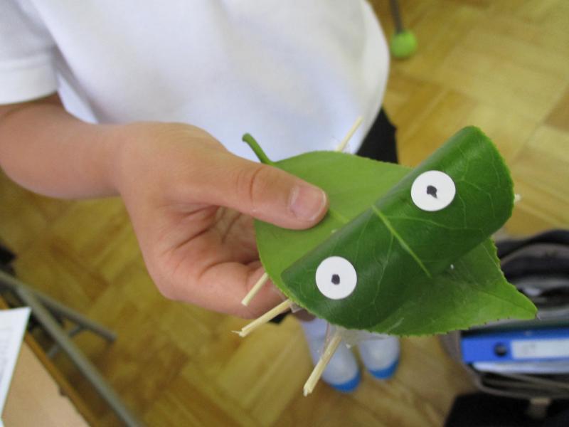 子供達は大きな葉っぱや細長い葉っぱなど様々な形の葉っぱを集めて、思い思いの虫を作っていました。