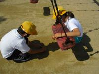 今日は、井上小学校のグラウンドのどんなところに水溜りが出来るかの予想を確かめるために、ビー玉を転がして地面のへこんでいるところを探しました。