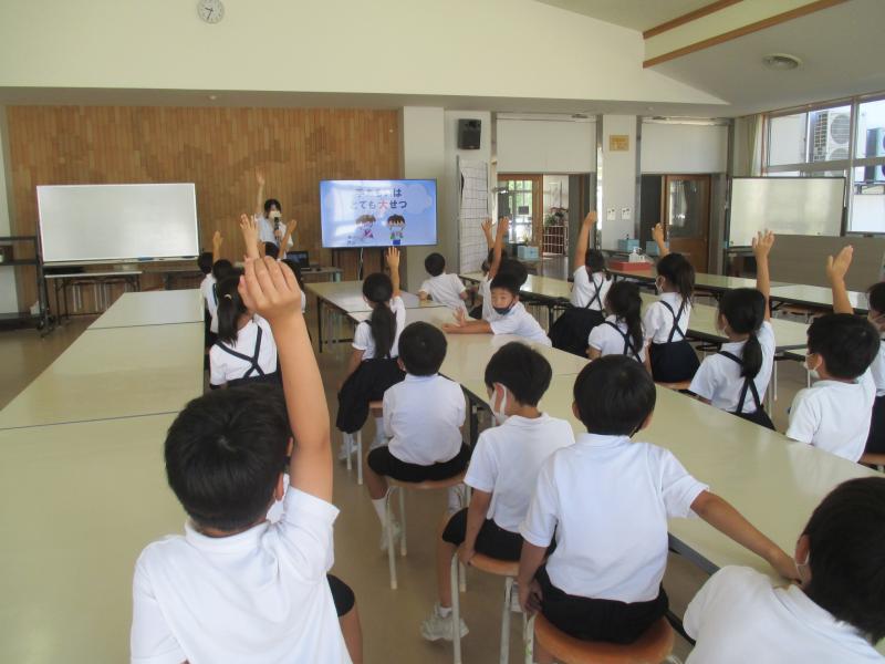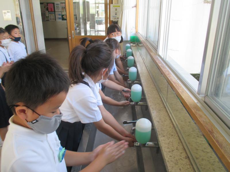 1組は6月27日、2組は30日に保健室の先生の上端先生から正しい手洗いの仕方を教えてもらいました!